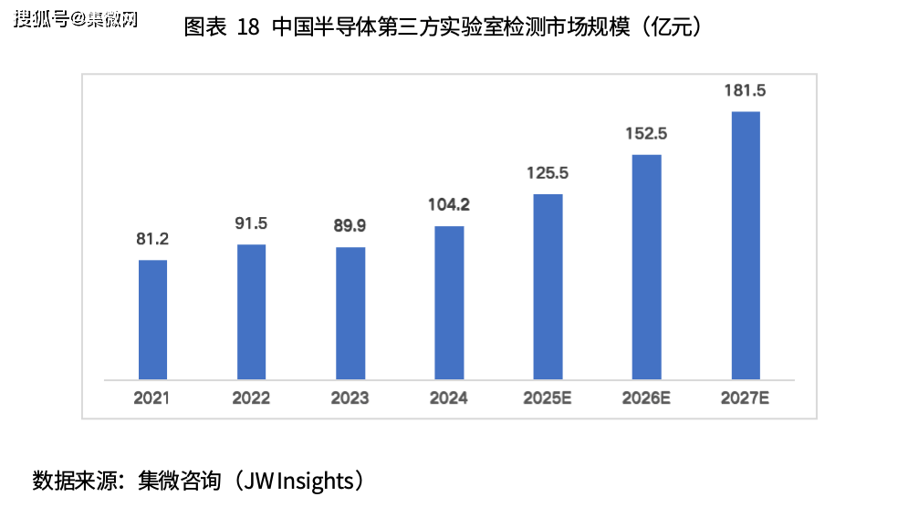 随着人工智能(AI)、5G等关键技术持续落地的推动下,半导体产业需求快速增长,国内半导体第三方实验室检测服务市场也迎来强劲扩张,市场前景广阔。集微咨询预计,2025年中国半导体第三方实验室检测服务市场规模将达到约125.5亿元,至2027年有望进一步增至181.5亿元。