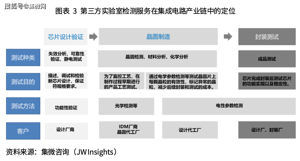 第三方实验室检测服务主要包括功能测试和物理验证等,这部分通常由第三方实验室为芯片设计企业和晶圆代工企业提供服务,主要涵盖可靠性分析(RA)、失效分析(FA)、材料分析(MA)、信号测试、芯片线路修改等,其中比较重要的包括可靠性分析、失效分析、材料分析等。相较于晶圆测试、成品测试等后道检测,可靠性分析、失效分析以及材料分析等实验室检测则贯穿半导体全产业链,检测对象包括产业链任一环节、量产前或量产后的样品,帮助企业加快研发进度、改进生产工艺。