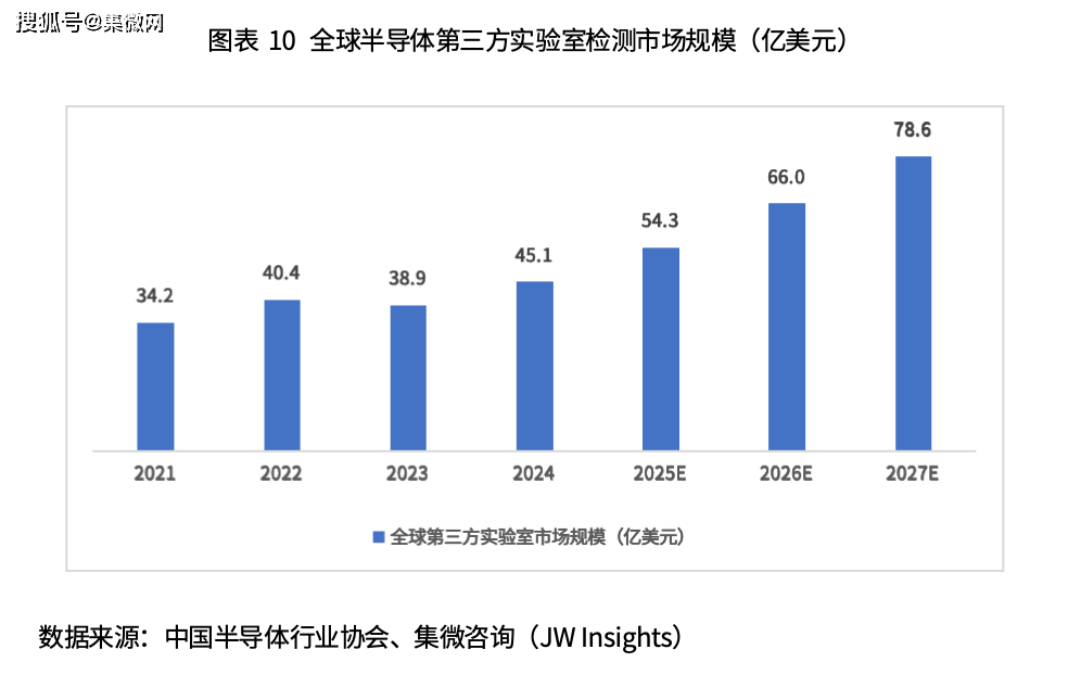 检测分析行业为各产业升级发展提供支撑性服务,与下游细分行业融合发展,新兴领域检测市场受益于新兴领域自身的高速发展,在整体检测检验市场中的收入占比逐渐提升。根据集微咨询测算,2025年全球第三方实验室检测服务市场规模为54.3亿美元,预计2027年市场有望达到78.6亿美元。