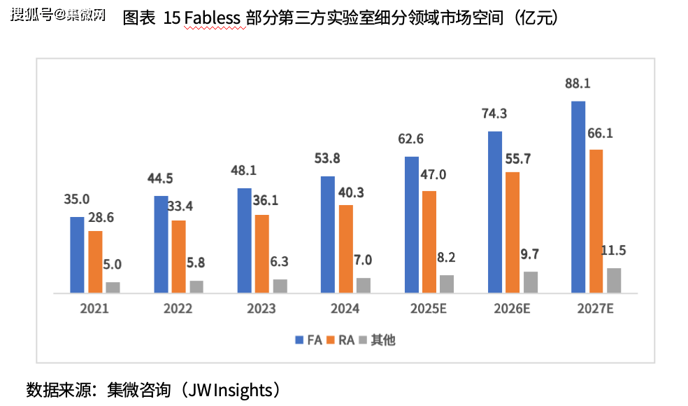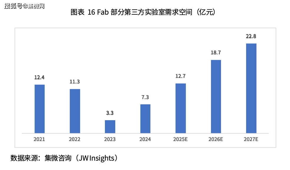 根据集微咨询测算,新增1万片/月产能对应的来自晶圆代工企业的第三方实验室服务市场空间增量约为1000-1500万元,因此2025年该部分市场增量约在12.7亿元左右,且随着已规划产能的逐步释放,预计2026年和2027年该部分市场空间将达到18.7亿元和22.8亿元。