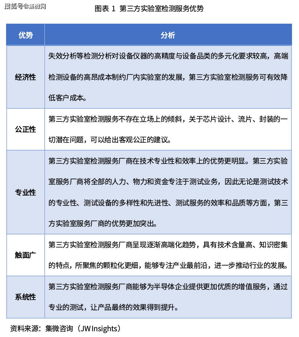 半导体第三方实验室检测服务即由第三方检测实验室为芯片设计企业、晶圆代工企业和封装企业提供服务,在芯片量产之前、量产中均进行严格的验证测试,协助提高芯片生产效率。半导体产能规模化与产品高端化令该市场需求逐渐增加,相较于传统一体化封测厂商与专业第三方晶圆/成品测试,半导体第三方实验室服务具备五重优势。