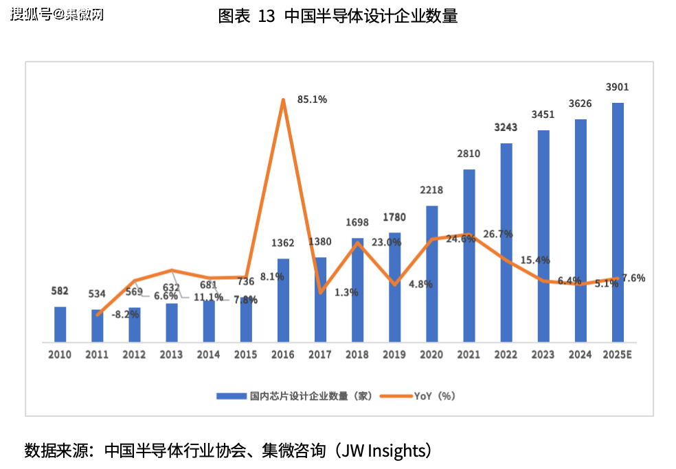 近年来,国内设计企业迅速扩张,2025年国内芯片设计企业的数量已达到3901家,比2024年的275家,数量增长了7.1%。