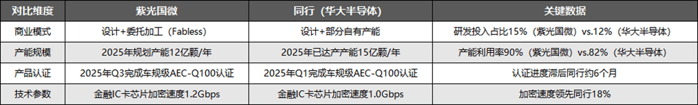 国内竞争格局呈现“双龙头+细分厂商”的特征,紫光国微和华大半导体为国内安全芯片行业一线龙头,据中国半导体协会2025年调研数据,两者合计市占率达60%。整体来看,紫光国微在技术研发和产能利用率方面具有优势,但在产能规模和产品认证进度方面仍需提升。