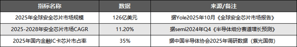 从市场规模来看,据Yole2025年10月报告,全球安全芯片市场2025年达126亿美元,其中国内市场占比约38%,主要集中在金融支付、智能卡及车载安全领域。从增长趋势看,semi2024年Q4预测2025-2028年安全芯片市场CAGR为11.2%,高于半导体行业整体5.8%的增速,核心驱动来自新能源汽车车载安全芯片和AI服务器可信计算芯片的需求爆发。